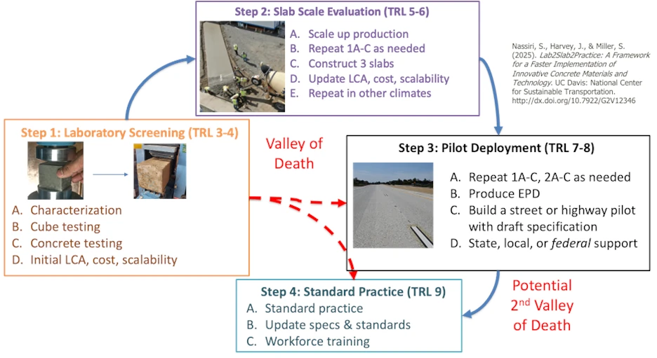 Lab2Slab follows a stepwise evaluation process that progresses materials through increasing scales of production, from controlled laboratory conditions to full-scale infrastructure implementation, providing risk assessment data from testing and construction at each step. By combining laboratory research, pilot-scale testing, and full-scale implementation, Lab2Slab provides a clear pathway from material innovation to real-world application while addressing barriers to adoption that can slow down industry-wide implementation. The stepwise approach ensures that technical performance, constructability, cost-effectiveness, and environmental impact are all validated before widespread use. It provides feedback to new materials suppliers at each stage to improve their product at each scale of production, reducing their costs and risks of going to a large field pilot project before they are ready.
